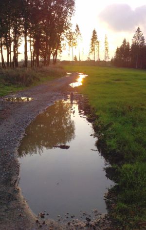 Links kommt eine Wiese, rechts Wald (das Foto zeigt den Rückweg Richtung Westen - daher ist rechts die Wiese und links der Wald). Dann müssen Sie den Weg nach rechts bergauf nehmen.